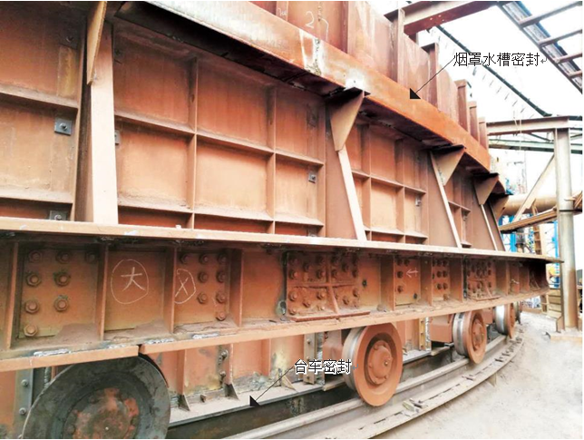 密封采用彈性可自調結構??筛鶕h(huán)冷臺車(chē)跑偏情況進(jìn)行彈性調整。對環(huán)冷機底梁、臺車(chē)輪、三角梁、煙罩等位置進(jìn)行有效密封。煙罩部分采用水槽式密封結構,保證煙罩圈梁始終在水槽密封內運行。密封后有效改善現場(chǎng)噴料、漏風(fēng)。改善現場(chǎng)環(huán)境,提高煙氣溫度,從而增加了發(fā)電量。